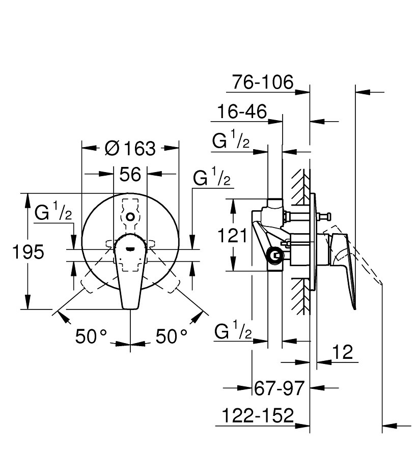 Αναμίκτης εντοιχιζόμενος μπάνιου / λουτρού πλήρης δύο εξόδων BauEdge σε χρωμέ φινίρισμα από την Grohe.