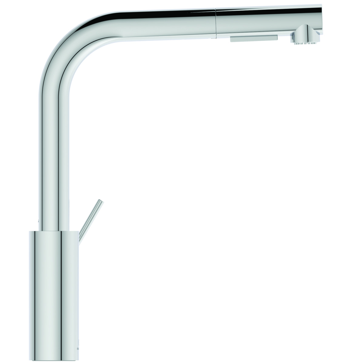 Αναμεικτική μπαταρία νεροχύτη Gusto με υψηλό ρουξούνι σε σχήμα L, με εύρος περιστροφής 360° και αποσπώμενη κεφαλή ντους 2 λειτουργιών.