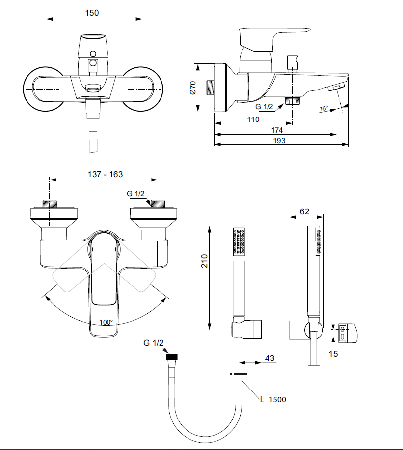 Επίτοιχη αναμικτική μπαταρία λουτρού σετ Connect Air Ideal Standard, με μηχανισμό 38 mm, μηχανισμό